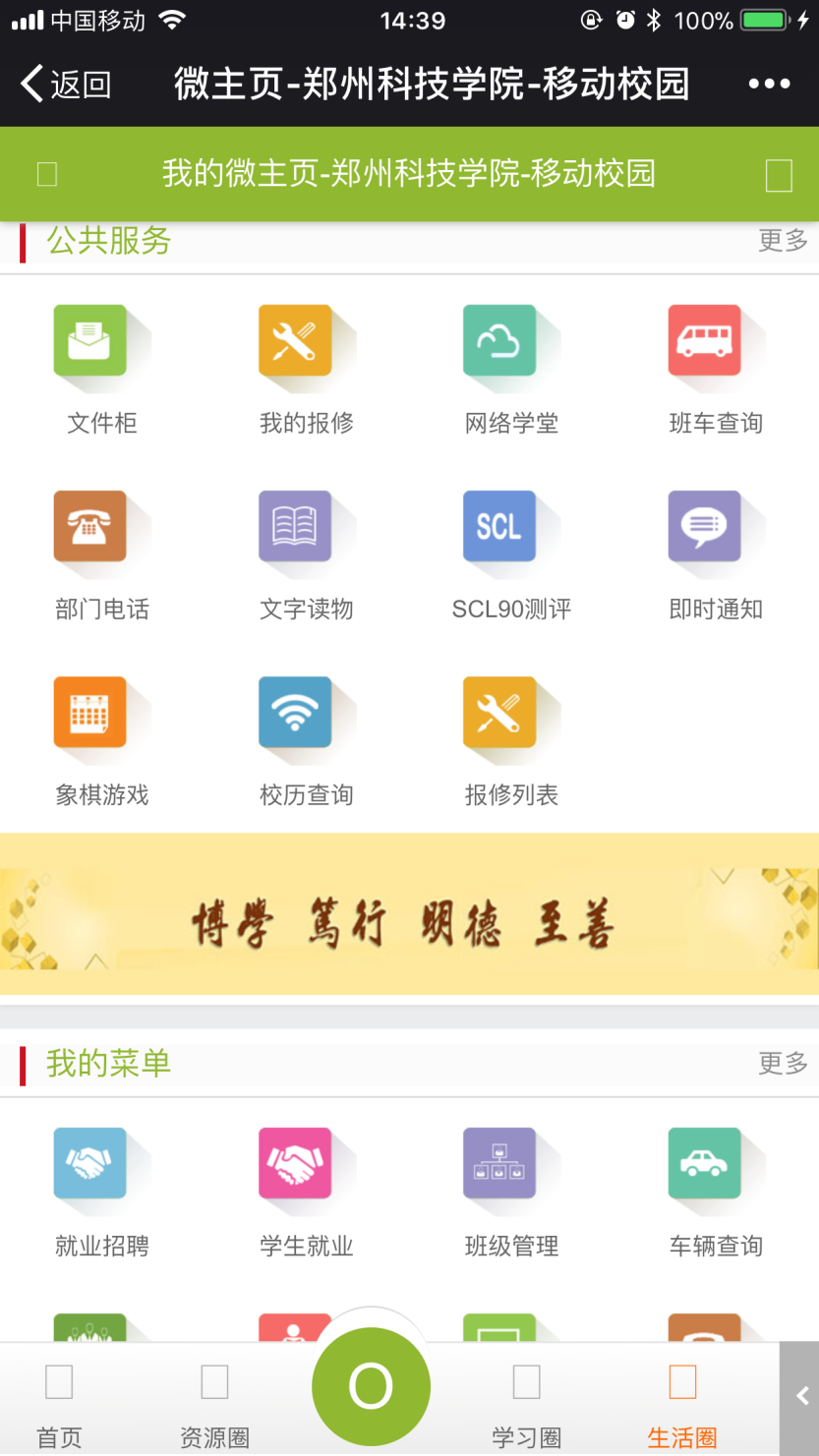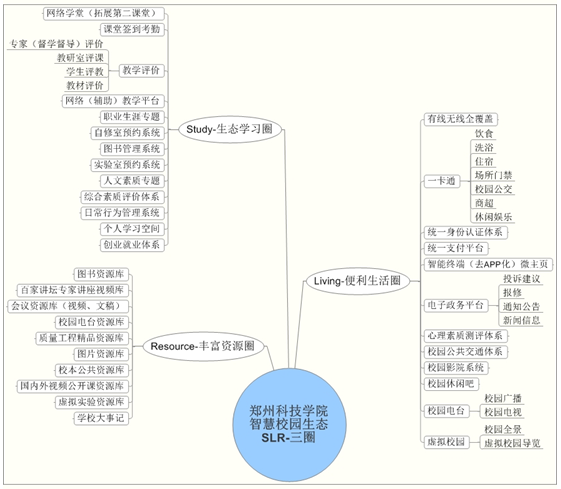 初期我校上线的应用以查询类服务、阶段性终端采集服务以及最“接地气”微应用为主。含:借阅查询、成绩查询、学业预警、课表查询、违纪/过失单查询、公物报修、学期报到、失物招领、我要拼车、违纪查询、规章制度查询、办事流程查询、智能车牌识别系统车辆注册、心理素质测评、部门考核等相对单一数据服务。将逐步对图3中的生活圈、学习圈、资源圈全面提供微服务,如图4郑州科技学院智慧生态圈。