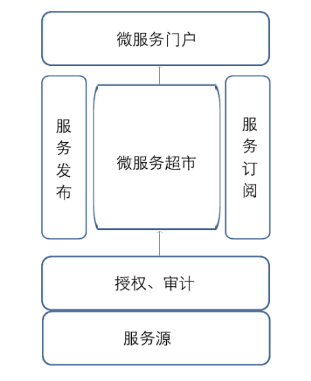 主要由五大部分组成:服务源、授权审计、微服务超市,服务发布及订阅组件、微服务门户,如图5、系统模型。