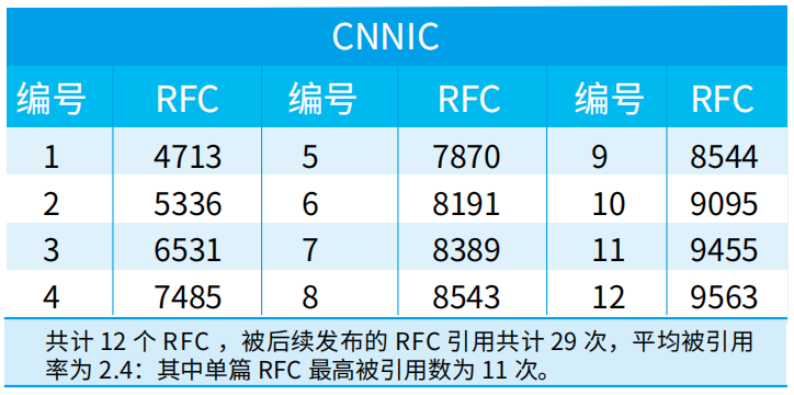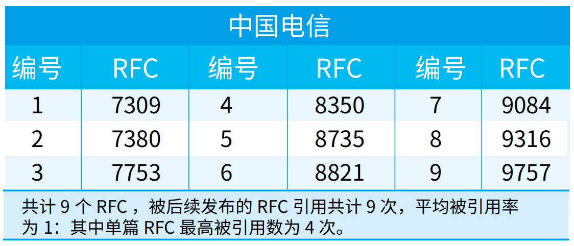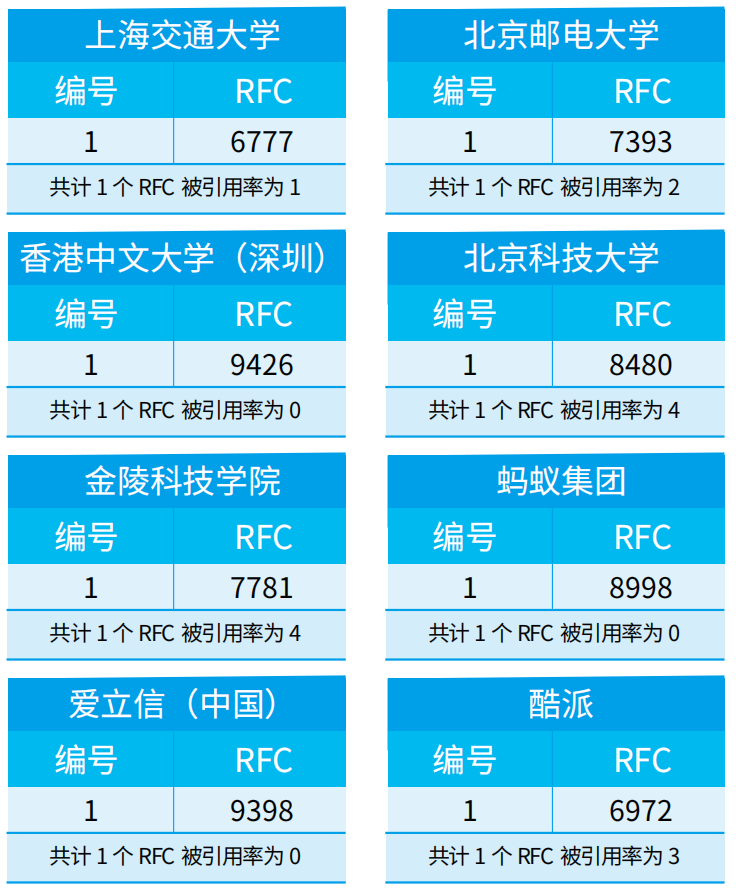 IETF负责制定互联网标准RFC。当前,全球一共有九千多个RFC,其中,第一作者来自中国大陆的有209个(其中有3个未显示第一作者单位)。根据RFC INDEX网站提供的资料,我们整理了由中国大陆作者牵头发布的所有RFC信息,按照第一作者所在单位进行分类,并统计了该单位RFC的总引用率(仅统计被其他RFC引用次数,被草案引用不纳入统计)。