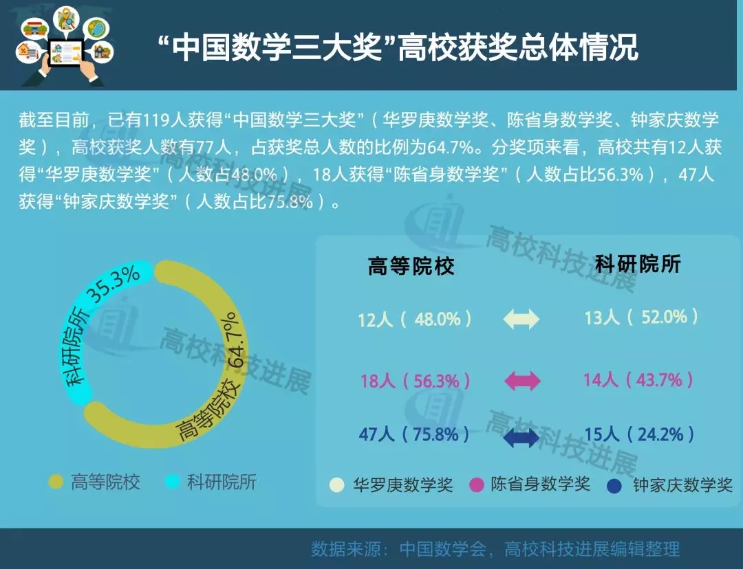 自“中国数学三大奖”自设立以来,“华罗庚数学奖”和“钟家庆数学奖”各评奖13次、“陈省身数学奖”评奖16次,已有119位数学家和数学领域骨干力量获奖。据相关数据统计结果显示,获奖者中有77人(占获奖总人数64.7%)为高校教学科研人员和博士生、硕士生,他们分别来自于国内的25所高校。