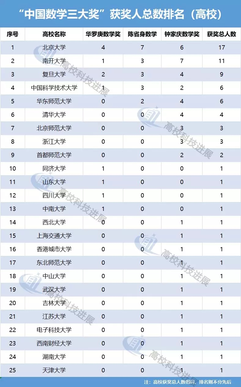 从25所上榜高校的获奖人数排名来看,北京大学以获奖总人数17人的优越成绩,领跑“中国数学三大奖”;南开大学、复旦大学分别有11人和9人获奖,位列第二、三名;中国科学技术大学、华东师范大学各有6人获奖,排名紧随其后;清华大学、北京师范大学、浙江大学、首都师范大学分别有4人、3人、3人、2人获奖,目前尚未进入高校获奖人数排名前五名。