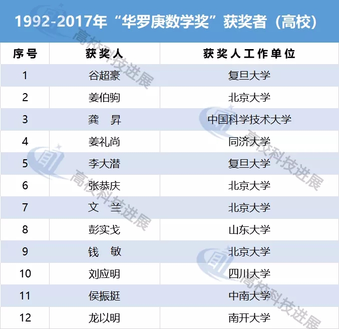 从历届“华罗庚数学奖”获奖名单来看,共有12位高校数学家获奖。北京大学有4位数学家获奖,复旦大学有2位数学家获奖,南开大学、中国科学技术大学、同济大学、山东大学、四川大学、中南大学、南开大学等6所高校各有1位科学家获奖。