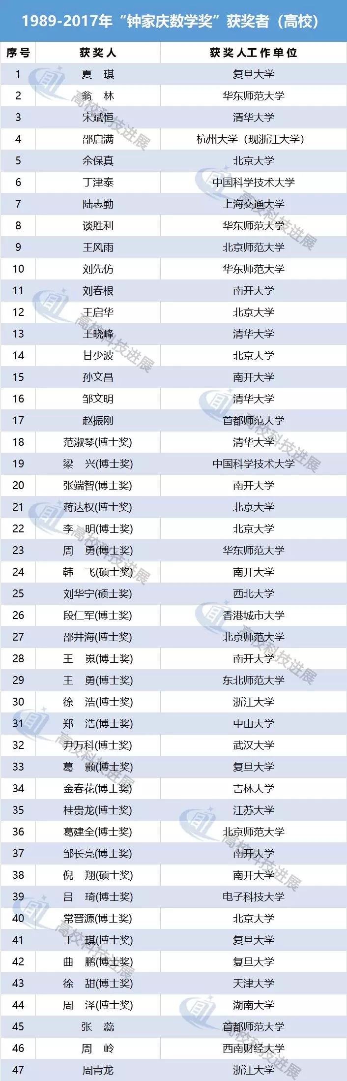 “钟家庆数学奖”是“中国数学三大奖”中,高校获奖人数最多的一个奖项,共有22所高校的47位博士和硕士获奖。