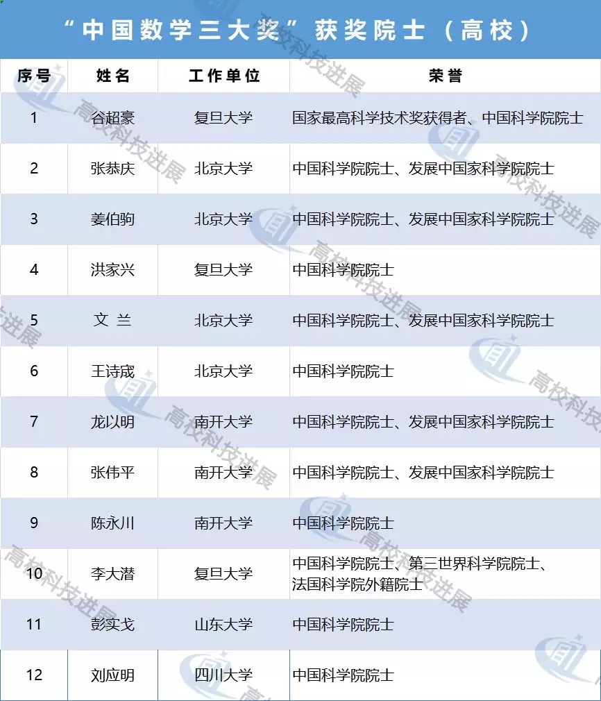 来自高校的“中国数学三大奖”得主“研”值究竟有多高?高校科技进展(微信公众号:gxkjjz)搜集到的信息显示,在77位高校获奖者中,共有1位国家最高科学技术奖获得者,12位中国科学院院士。