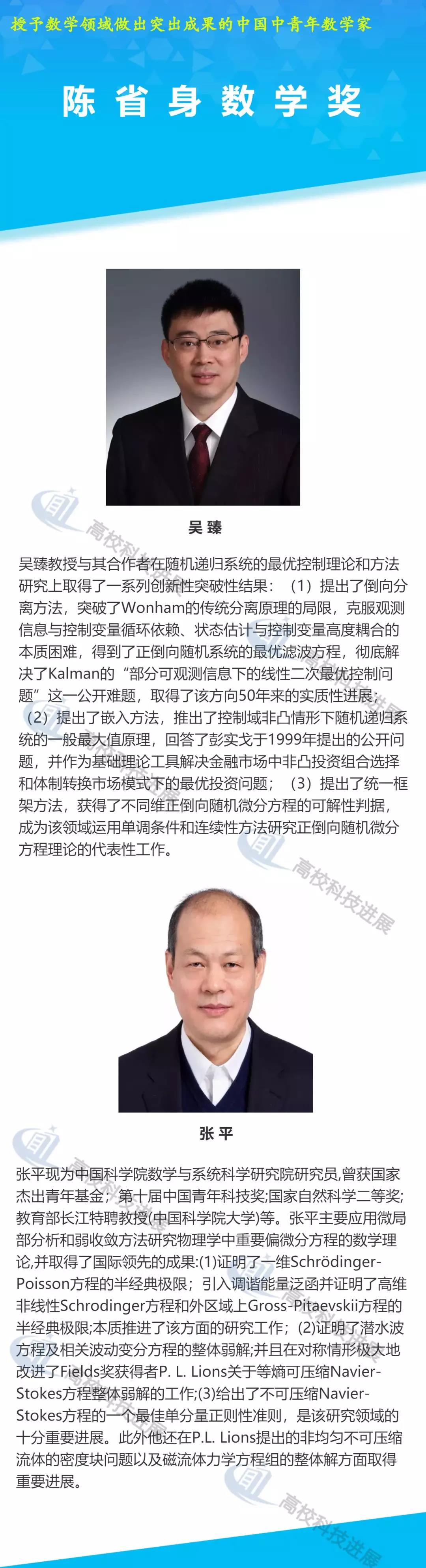 山东大学吴臻教授、中国科学院数学与系统科学研究院张平研究员获得本届“陈省身数学奖”。吴臻教授本次获奖,是山东大学数学家首次获得该奖项。