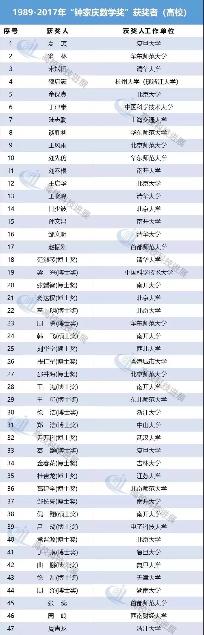49位“钟家庆数学奖”获奖者分别来自南开大学、上海交通大学、浙江大学、中山大学、吉林大学、中南大学、电子科技大学等23所高校。南开大学共有7位博士获奖,荣登“榜一”。