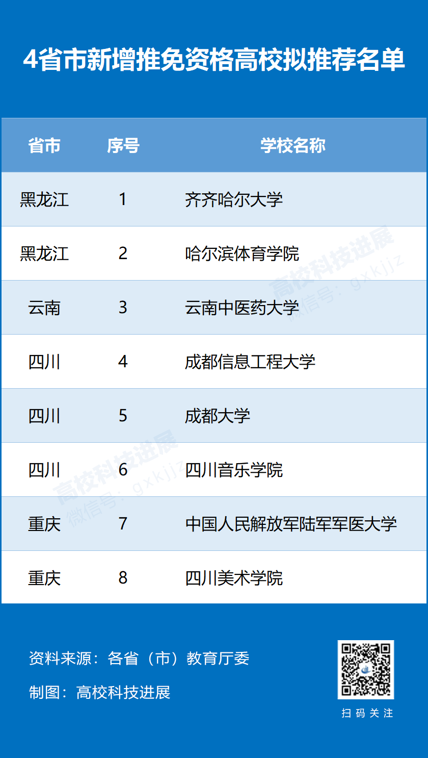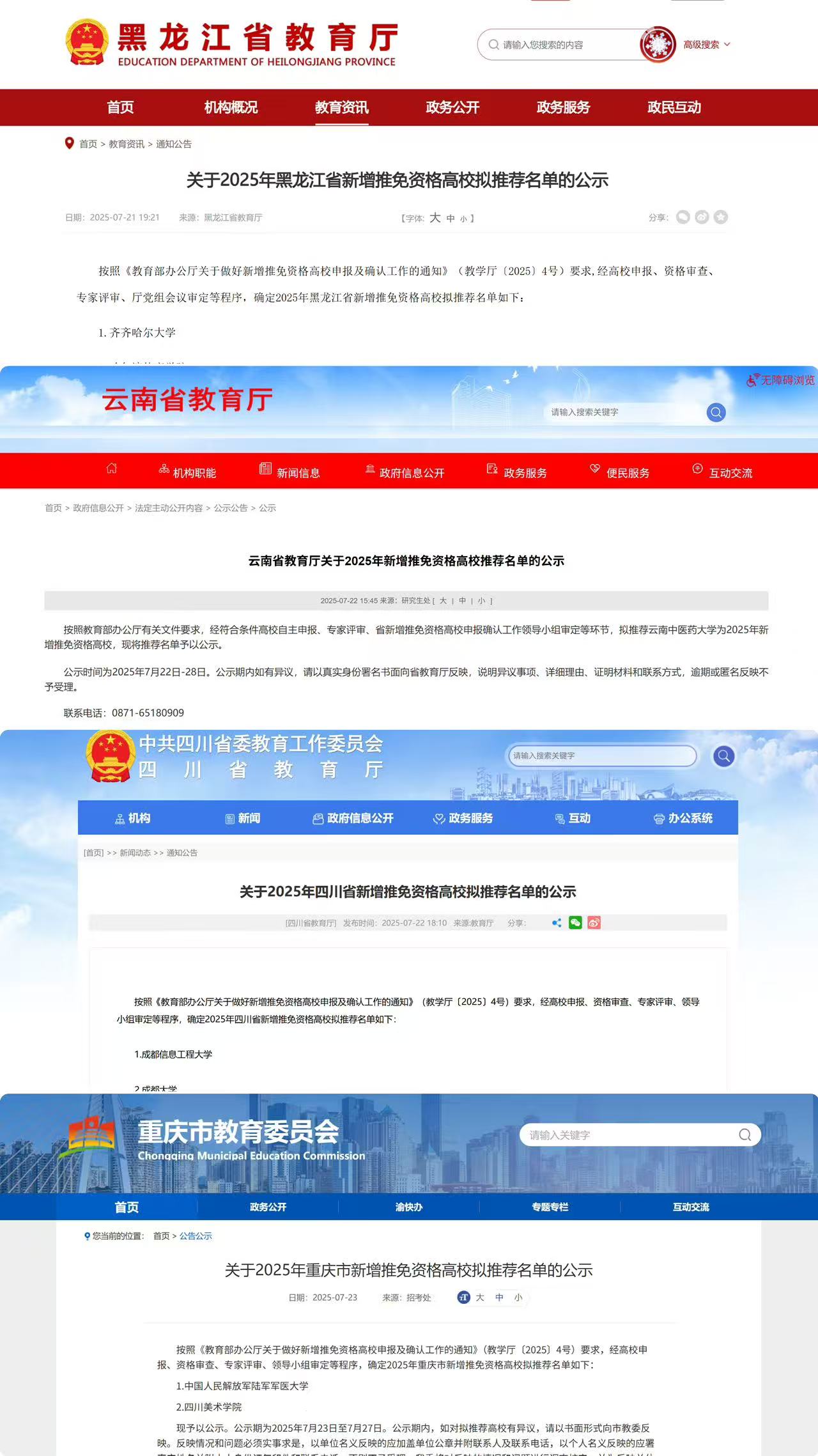 7月21日-23日,黑龙江省教育厅、云南省教育厅、四川省教育厅、重庆市教育委员会相继公示2025年新增推免资格高校拟推荐名单。