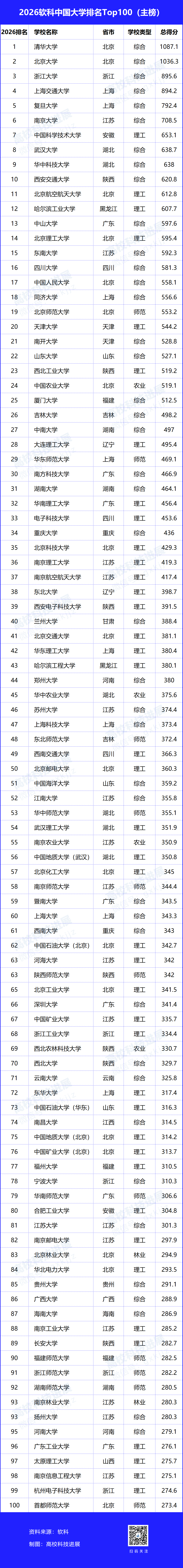 2026年4月15日,高等教育专业评价机构软科正式发布“2026软科中国大学排名”。