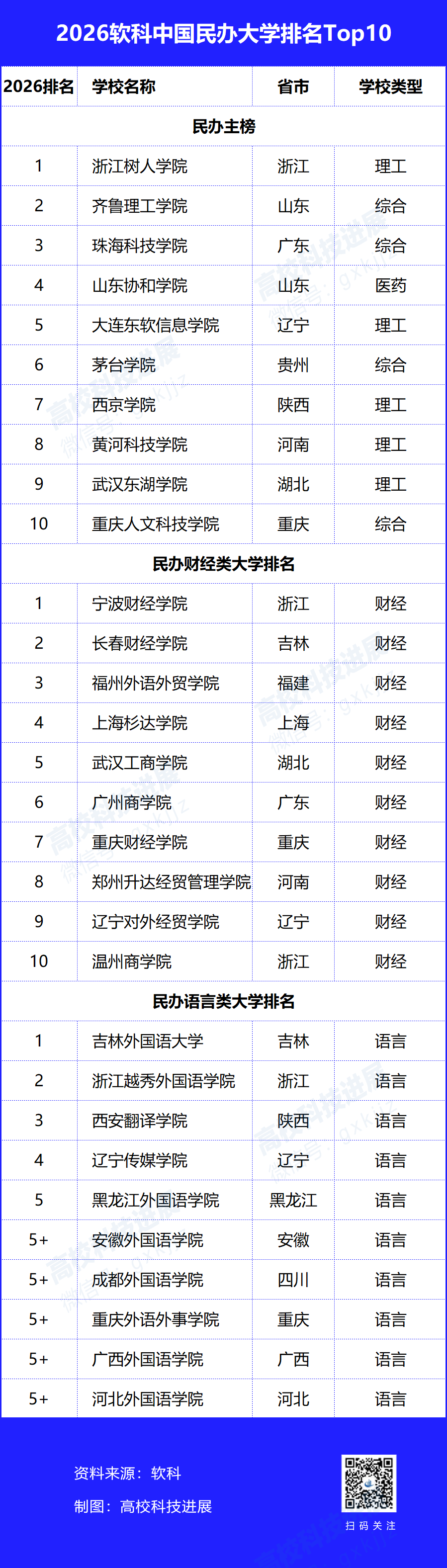 民办高校分为民办高校主榜、民办财经类高校排名、民办语言类高校排名3个榜单。其中,浙江树人学院居民办高校主榜榜首,齐鲁理工学院、珠海科技学院位于民办高校主榜全国前三。此外,宁波财经学院和吉林外国语大学分别位列民办财经类大学和民办语言类大学排名第一位。