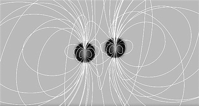 中子星合并模拟图,白色代表磁力线。图片来源:《自然》杂志官网