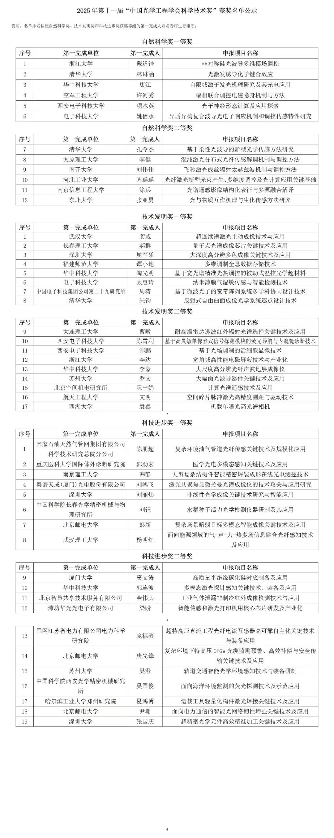 根据《中国光学工程学会科学技术奖管理办法》,第十一届“中国光学工程学会科学技术奖”在广大会员和相关单位的积极参与下,所有申报项目经过形式审查、函评和现场答辩等环节,终评委员会本着质量第一,宁缺毋滥的原则,最终有48项获选。其中,“自然科学奖”一等奖6项、二等奖6项;“技术发明奖”一等奖8项、二等奖9项;“科技进步奖”一等奖8项、二等奖11项。现予以公示。