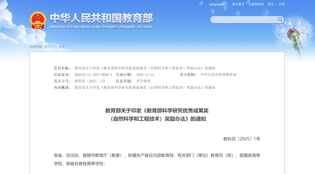 日前,教育部网站发布关于印发《教育部科学研究优秀成果奖(自然科学和工程技术)奖励办法》的通知。根据通知, 教育部科学研究优秀成果奖(自然科学和工程技术)实行提名制,每三年提名、评审一次。