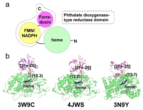 结构分析表明,在这种酶中,FMN足够接近铁硫簇以实现直接电子转移;但血红素离铁硫簇太远,不允许电子直接转移,而是依靠5个“二传手”氨基酸实现传递。