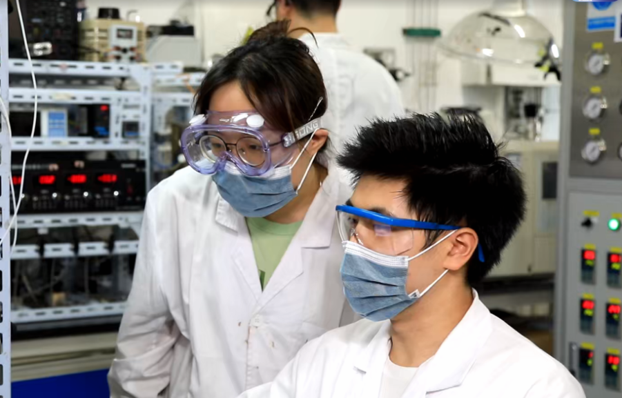 新能源化工团队负责人巩金龙教授(右一)与团队成员交流讨论实验方案