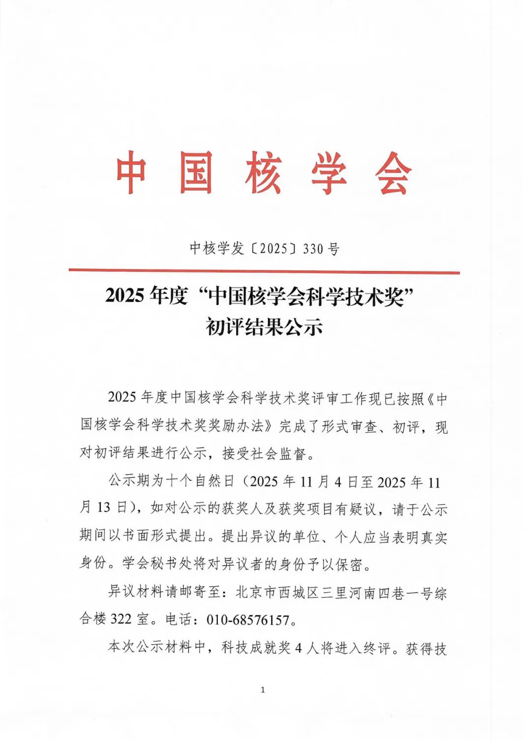 日前,中国核学会网站发布《2025年度“中国核学会科学技术奖”初评结果公示》,公示期为2025年11月4日至13日。