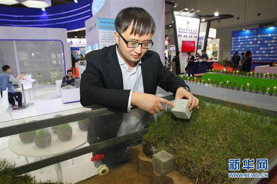 11月7日,上海理工大学的参展人员在展示讲解“河道底泥资源化及原位生态修复系统”。
