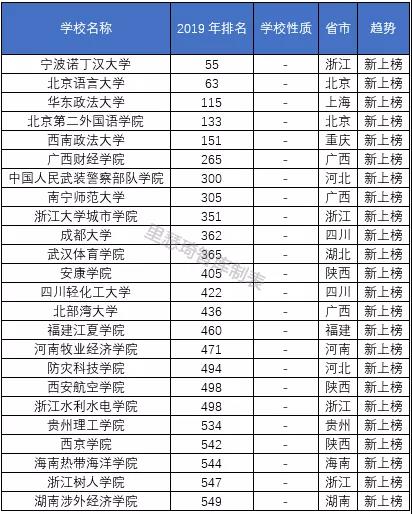 除以上四类学校之外,另有24所新进高校,其中表现最为亮眼的非宁波诺丁汉大学莫属。宁波诺丁汉大学于2005年才被教育部正式批准设立,距今只有14年办学时间,此次新入榜单便高居全国百强,位列第55位;除宁波诺丁汉大学之外,北京语言大学也是新进高校,同时也进入全国百强,位列第63位。两所新进高校的的优异表现确实即令人赞许又令人惊叹。24所新进高校如下表5: