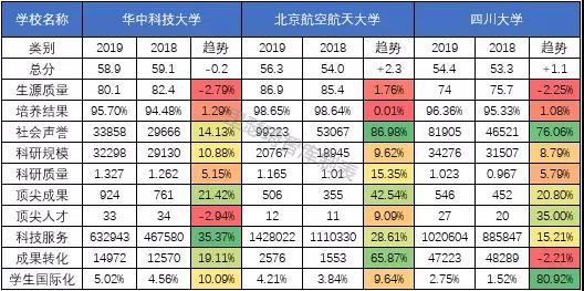通过以上学校类型的划分我们可以看出今年的软科中国最好大学排名多数学校是进步的,退步的学校占少数。但是我们也发现,两年间排名变动超过30位的大学有260所之多,所占比例接近一半,这是一个极其诡异的现象。因为一所大学的建设是一个漫长的过程,短短一年发生如此大的变动,并且数量如此庞大,不得不让人产生很多疑问。是什么指标在推动这些大学在软科排行榜上变动?我们不妨来简单看下各所学校的指标变动情况。