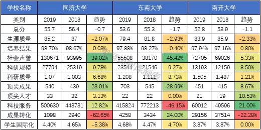 由上两表可以看出,各个学校的指标都有或多会少的变动,但是也有其非常明显的共性。观察来看,排名上升的三所学校在顶尖成果(高被引论文·篇)和科技服务(企业科研经费·千元)这两个指标上都有非常明显的进步,对比其余指标的变动情况看,这两个指标也是三所学校排名上升的重要原因。而排名下降的三所学校在生源质量(新生高考成绩得分)上均呈下降趋势,这是三所学校排名下降的一个共性原因。此外,同济大学和南开大学的成果转化(技术转让收入·千元)以及东南大学的科技服务(企业科研经费·千元)这两个指标的下降幅度非常明显,这是三所学校排名下降的个性原因。