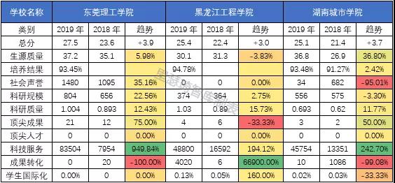 无独有偶,和排名上升的顶尖大学呈现一样的规律,排名上升幅度最大的三所大学也在科技服务(企业科研经费·千元)这一指标上有较为明显的上浮。而排名下降幅度最大的三所大学很多数据都是0或者空着,尤其是培养结果这一栏,三所大学2019年的数据显示为空。拿上海体育学院为例,其除了培养结果这一指标外其余指标相对去年都是上升或者持平,但是总分却少了将近4分,这和缺失的培养结果数据必然有直接的联系。榜单中200名之后的高校很多都面临这个共性问题,就是很多数据是没有的,这就导致了其中某一项指标对该校的整体得分可能产生决定性影响。并且和顶尖大学的指标变化趋势对比就会发现,这些变化幅度较大的高校有些指标变动的幅度也是非常夸张。这些问题都难以避免的会造成对大学评价的偏颇,也会向大众传递错误的信息。