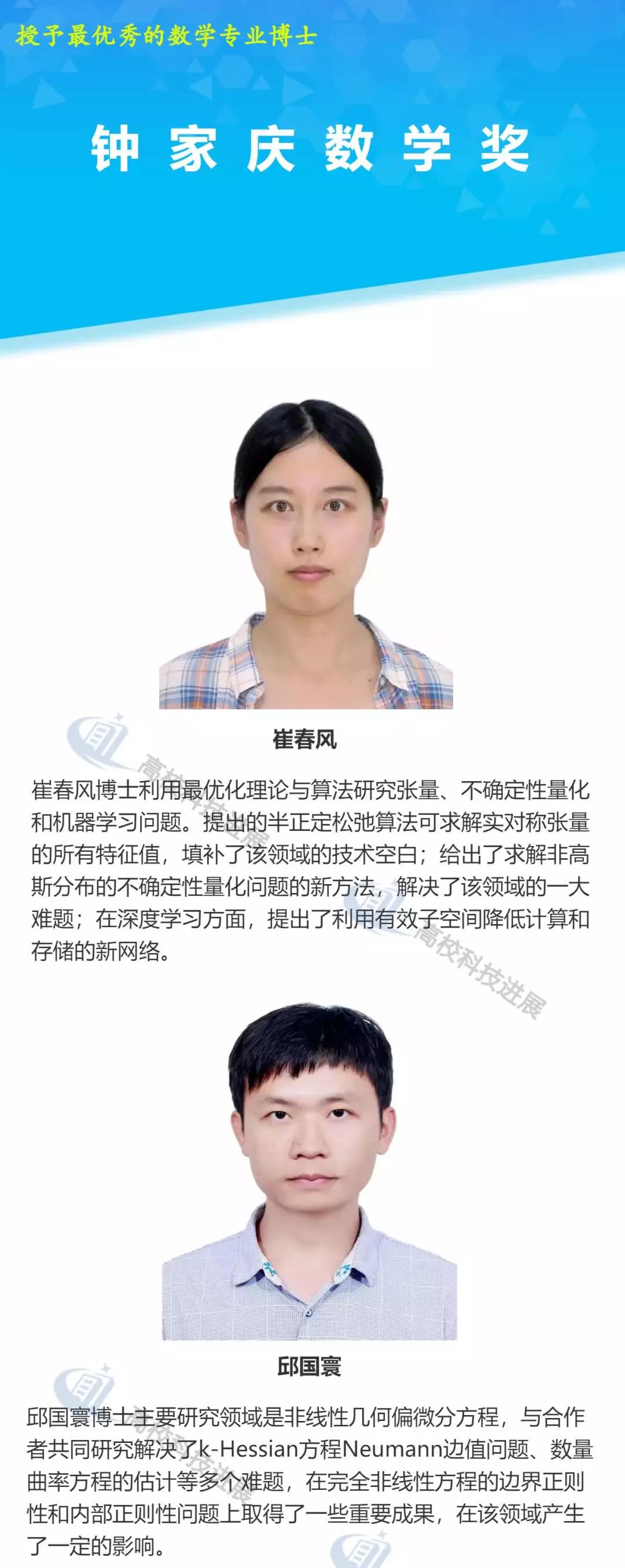 江苏师范大学解龙杰博士、香港中文大学邱国寰博士、美国加州圣塔芭芭拉分校崔春风博士和美国俄亥俄州立大学吴开亮博士获得本届“钟家庆数学奖”。本届获奖者所在高校,均为首次“入榜”“钟家庆数学奖”名单。