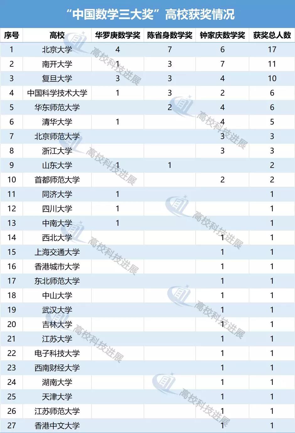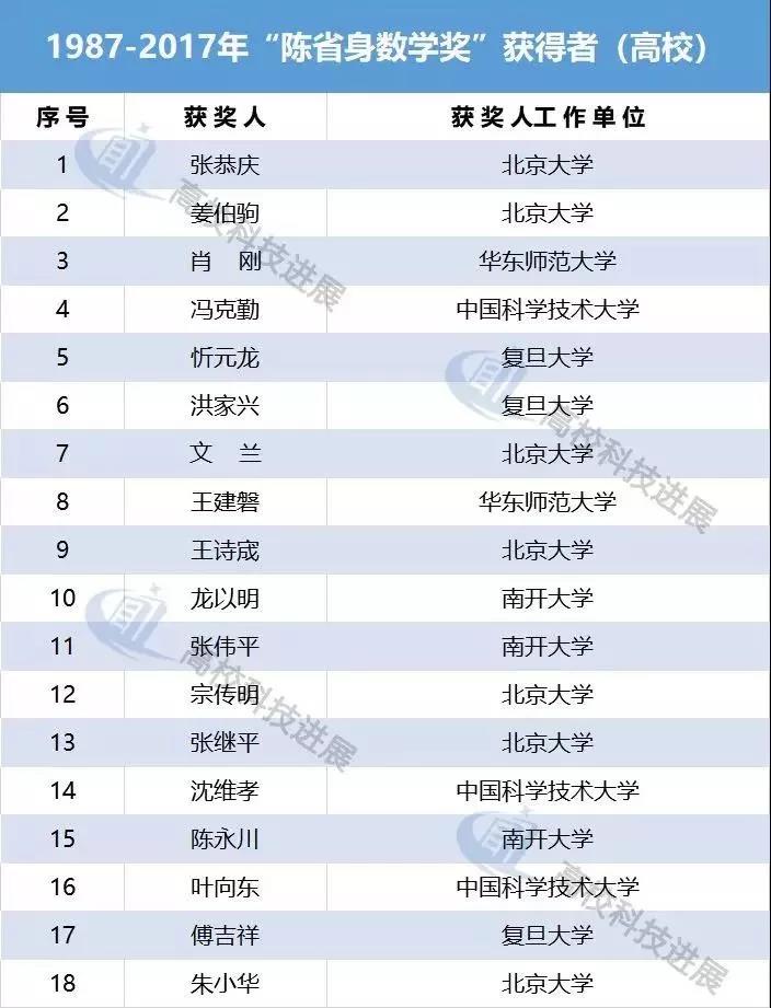 19位“陈省身数学奖”获奖者分别来自北京大学、复旦大学、清华大学、中国科学技术大学、华东师范大学、山东大学。北京大学共有7位学者获奖,继续领跑该奖项。