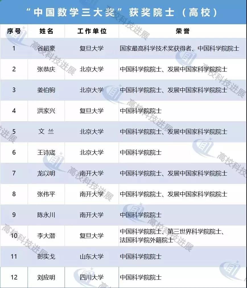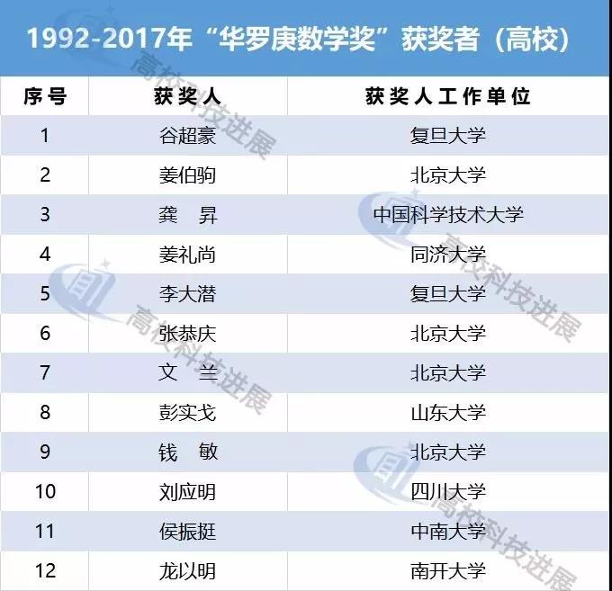 14位“华罗庚数学奖”获奖者分别来自北京大学、复旦大学、清华大学、同济大学、四川大学等9所高校。北京大学共有4位学者获奖,位居该奖项榜首。