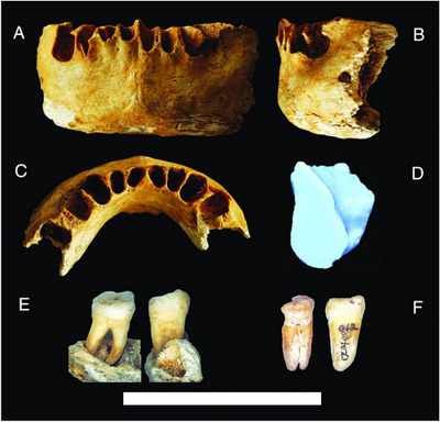 右图为在广西崇左木榄山智人洞发现的10万年前的人类化石(A下颌骨前面;B下颌骨左侧面;C下颌骨上面;D下颌联合中部激光扫描断面;E、F两枚牙齿的颊侧面和近中面)