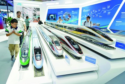 7月13日,参观者在北京科博会现场参观展出的动车组模型。新华社记者 张晨霖摄