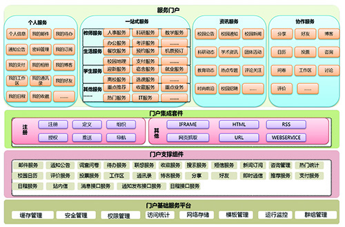 基础业务类服务平台包含许多学校业务流程中比较独立的、可重复使用的功能,这些服务单元既能对外独立提供服务,也以接口的形式为其他服务提供支持。如学校统一收费系统、视频点播直播系统、通用注册系统、网上预约系统等。