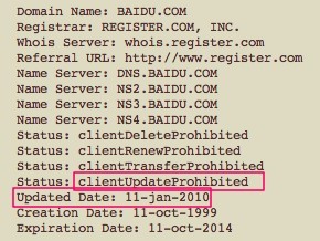 同时,REGISTER.COM为了避免事态扩大,还给baidu.com的域名加了几个状态,clientUpdateProhibited、clientDeleteProhibited、clientRenewProhibited,直白说这几个状态就是禁止更新这个域名、禁止删除这个域名、禁止这个域名续费。特别是clientUpdateProhibited,加上后这个域名别说DNS,连whois信息都不允许修改。对于通过漏洞来修改域名信息的,这个方法的确能起到一定的作用,至少黑客一时半刻是没法再改东西了。等REGISTER.COM自身的漏洞修复后,可以把这些状态再去掉。