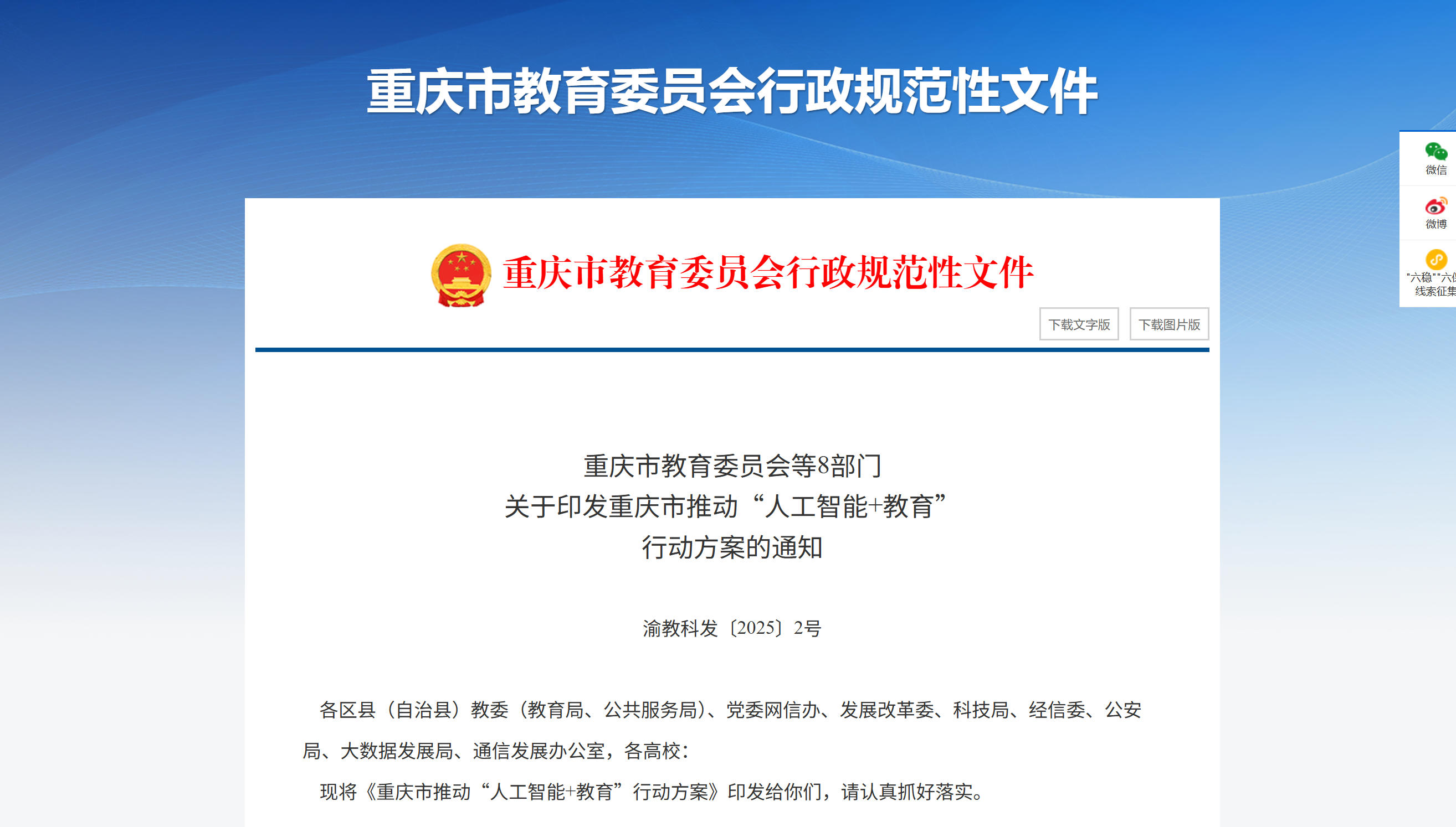 为深入贯彻国家“人工智能+”战略,认真落实国家教育数字化战略行动和数字重庆建设部署要求,加快构建“人工智能+教育”新生态,根据《重庆市推动“人工智能+”行动方案》,特制定本方案。