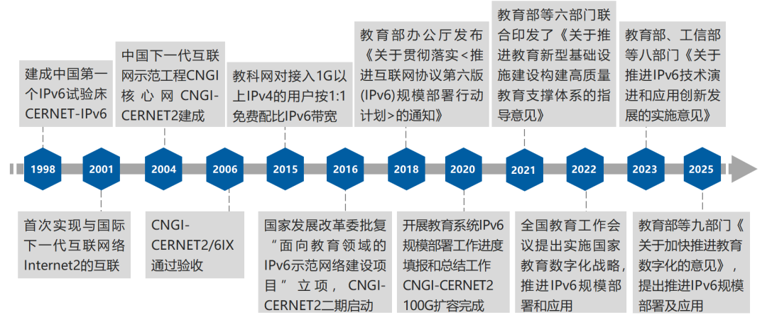 IPv6网络具有更大的地址空间、更强的安全特性、更快的传输速度,以及更简洁的网络配置,是推动教育数字化发展的关键基础设施。在推进IPv6部署和应用的过程中,我国制定了一系列顶层战略规划。