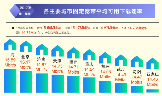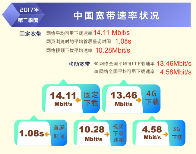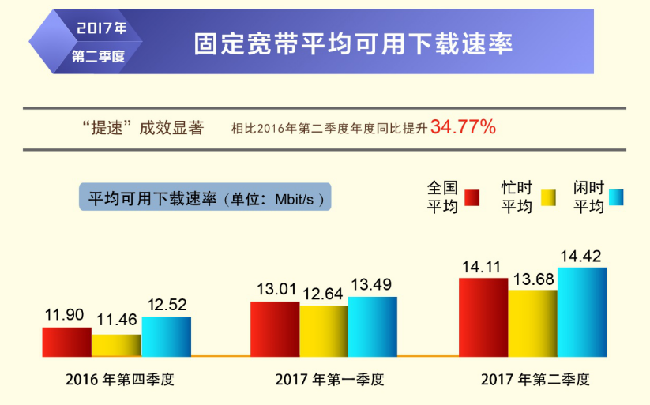 宽带发展联盟日前发布的2017年第二季度《中国宽带速率状况报告》显示,该季度我国固定宽带网络平均下载速率达到14.11Mbit/s,比2017年第一季度提高1.1Mbit/s,同比去年第一季度提升34.8%。