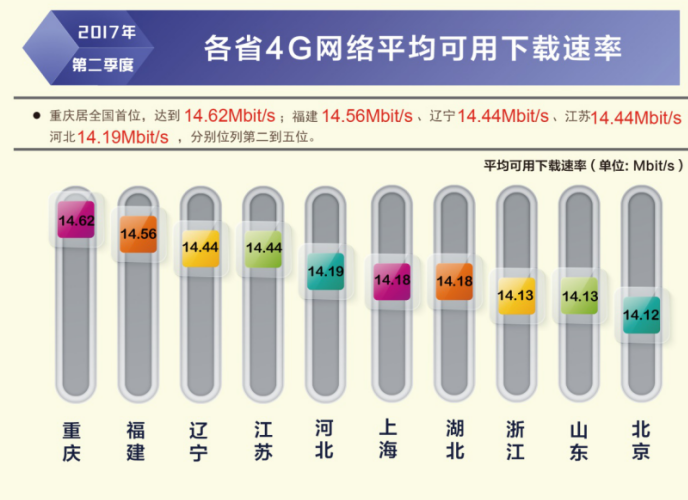 《报告》显示,除西藏自治区外,全国其他所有省级行政区域固定宽带平均下载速率均超过12Mbit/s,上海、北京、辽宁率先超过或达到了15Mbit/s,位列全国前三,山东、江苏紧随其后。在直辖市和省会城市固定宽带下载速率排行榜上,上海、北京、济南、天津、福州位居前五位。从移动宽带网速状况看,重庆、福建、辽宁、江苏、河北的4G网络用户下载速率排在全国省级行政区前五位;不同电信运营企业中,中国联通的3G网络用户下载速率和4G网络用户下载速率均最高,分别达到5.20 Mbit/s和15.05 Mbit/s。