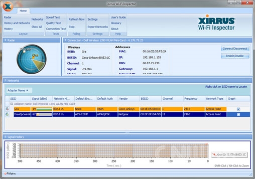 这是又一款很棒的可以找出Wi-Fi网络的程序,它也能提供不少很中肯的相关信息,比如某个Wi-Fi网络离你近还是远。Xirrus Wi-Fi探测器可以在一个类似雷达屏幕一样的界面上显示周边每一个热点。旁边的窗口则提供每个热点的详细信息,包括信号强度、网络类型(例如802.11n)、路由器厂商、网络传输信道、该热点是一个接入点还是专用网络。