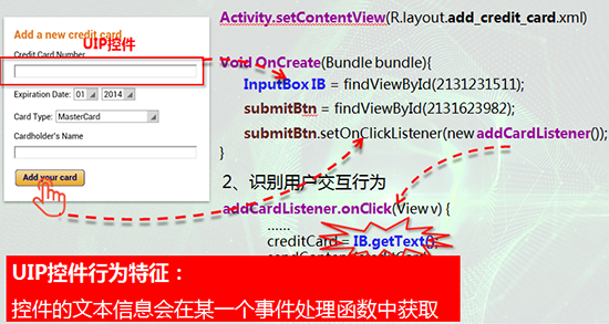我们核心的思路是想基于这个程序,访问控件文本的行为它到底是不是在获取用户输入的一些文本。举个例子,左侧是一个输入信用卡的卡号界面,右边是对应的代码。我们分析后发现,这个控件是一个隐私相关控件,它在这个地方会得到应用。我们发现它有一个函数,我们发现在addcardlistener的框架里面,会有一个文本。我们获取的这样一种特征,作为识别一个空间到底是不是接收、输入的判断标准地从而比较好的将哪些只显示隐私文本的相关控件去除掉。
