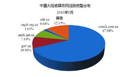 9月,我国大陆地区被篡改网站的数量为2489个,与8月的2257个相比增长10%,其中代号为“aGReSiF” 、“Hmei7”和“HEXB00T3R”的攻击者对大陆政府网站进行了大量篡改。9月我国大陆网站被篡改数量有所回升。