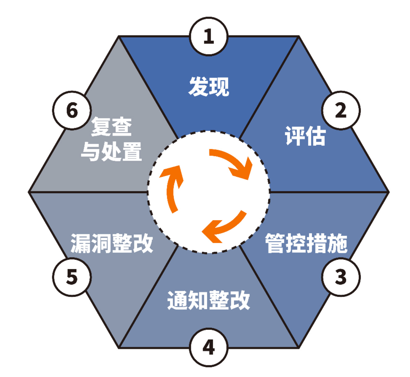 按照漏泄处理的过程,我们把信息系统的漏洞管理分为6个环节,分别是漏洞发现、评估、对漏洞所在信息系统采取管控措施、通知整改、漏洞整改、漏洞复查和处置,称之为信息系统漏洞的闭环管理,如图1所示。6个环节都有不同的工作重点和处理细节,下面分别加以介绍。