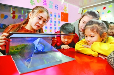 1月11日,山东省聊城大学美术学院学生来到聊城市翰林苑幼儿园,向小朋友们展示自己设计制作的3D全息投影仪。小朋友们通过观看“地球”“海底世界”等3D影像,近距离感受科技魅力。