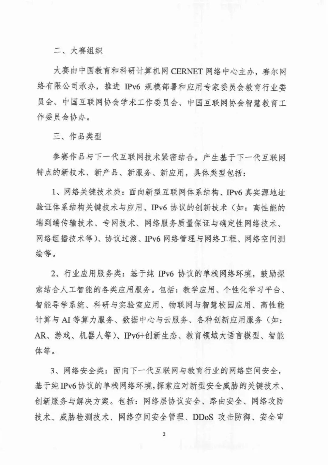为响应《国民经济和社会发展第十四个五年规划和2035年远景目标纲要》要求,贯彻落实《推进互联网协议第六版(IPv6)规模部署行动计划》,加快推进教育系统IPv6规模部署与应用,更好发挥中国教育和科研计算机网CERNET在下一代互联网创新和人才培养方面的重要作用,在推进IPv6规模部署和应用专家委员会的指导下,中国教育和科研计算机网CERNET网络中心、赛尔网络有限公司定于2025年7月至12月举办“第三届IPv6技术应用创新大赛科教赛道暨第八届下一代互联网技术创新大赛”。现将有关事宜通知如下:
