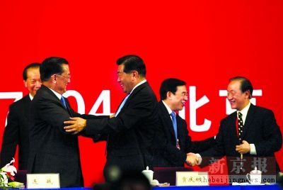 贾庆林和国民党荣誉主席连战在大会结束后握手致意。记者 韩萌摄