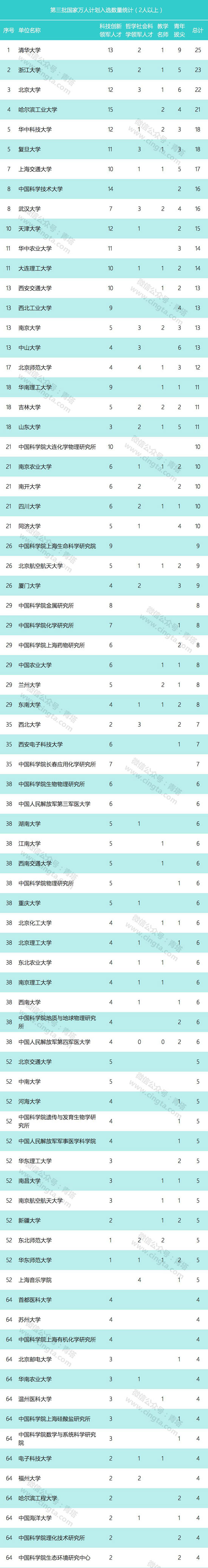 第三批国家万人计划入选者的工作单位统计和具体名单如下(统计结果不含科技创业领军人才;各高校附属医院、研究生院纳入高校进行统计;仅统计入选人数在2人以上的单位):