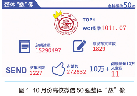 10月,高校微信公众号50强中,共发布文章1829篇,总阅读达到153万。具体情况,见图1。相比较9月,上述数据,除发布次数和总阅读量小幅下降之外,其他数据都呈增长趋势。