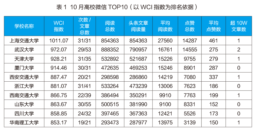 以WCI指数为排名依据,整理出10月高校微信TOP10榜单,如表1所示。其中,上海交通大学已经连续五个月排名第一,天津大学、西安交通大学、山东大学、华南理工大学空降榜单。