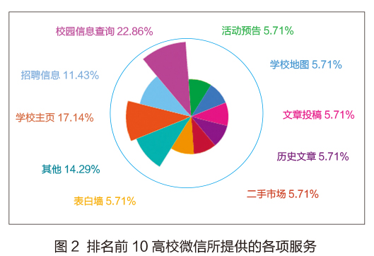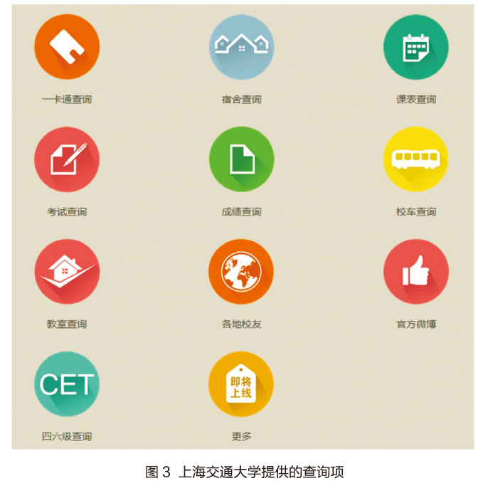 学校官方微信往往下属于学校的校党委宣传部或是团委,有专业的主管老师进行把关。随着微信公众号自身功能的增多,高校官微也不单单是信息传播的渠道,也是为校内学生提供服务的“服务号”。单以前十名高校官微为例,10所高校中,或通过功能条,或通过自动回复,都以不同形式为在校生提供信息查询。图2显示出,10所高校所提供的各项服务及其所占比重。可以发现,校园信息查询是近八成的学校都会提供的服务功能。图3显示了上海交通大学所提供具体的查询项,成绩查询、课表查询、空教室查询和四六级查询都是在校生日常学习生活中常常使用到的。近六成的学校会链接到学校的官方网站,打通了学校对外宣传平台,引入更多流量。另外,四川大学等学校还特意设计了适合在微信终端上阅读的学校“微主页”,方便受众阅读。