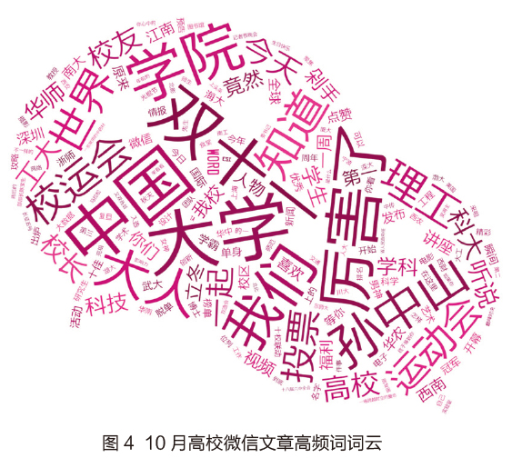 我们通过调取11月份上半旬288所高校发表4665篇中阅读量排名前1000篇文章的大数据,制作图4所示的微信文章高频词词云。出现频率较高的三个词汇是,出现336次的“大学”、297次的“双十一”、和277次的网络词汇“厉害了”。