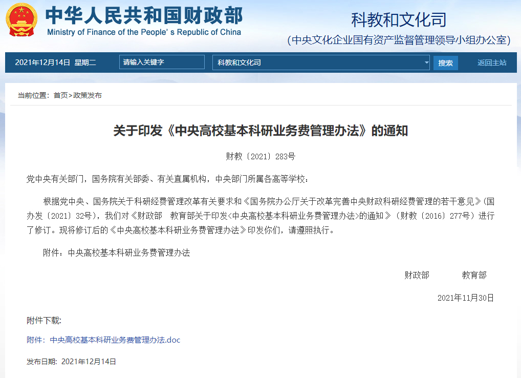 近日,财政部、教育部联合印发修订后的《中央高校基本科研业务费管理办法》(以下简称《管理办法》),旨在加强对中央高校自主开展科学研究的稳定支持,提升中央高校服务国家发展战略能力、自主创新能力和高层次人才培养能力,提高资金使用效益。