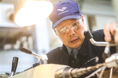 工程师在加工C919的气密试验接头。