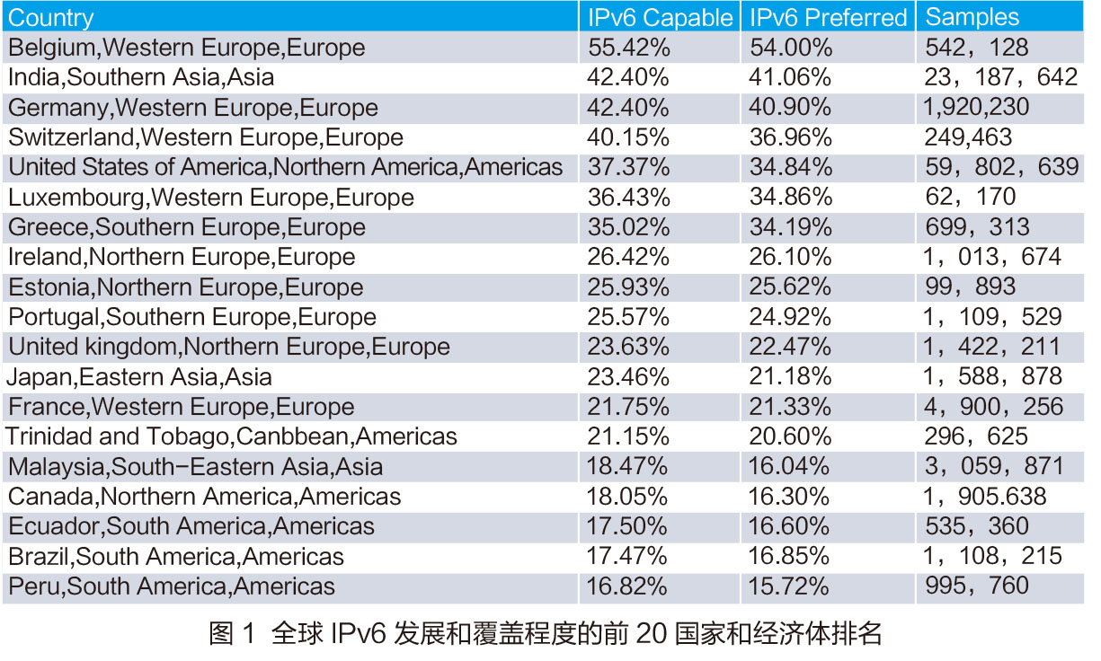 三,如今,IPv6覆盖很多国家和经济体,根据IPv6发展程度和覆盖程度,我们进行了全球前20国家和经济体排名。名列排行榜的大多数国家都是欧洲的国家,但是,也有发展中国家,像印度、厄瓜多尔、巴西、秘鲁等等,它们的IPv6发展非常快。如图1所示。